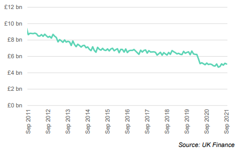 To underline this reality, take a look at overdraft balances. Although the market has restructured over time, and overdraft balances feel at the start of the first lockdown, lots of people are still entrenched in their overdraft, with well over £4bn being lent to UK consumers via this facility. UK Finance observe that this is likely a sign that there is no “increasing household financial stress”, recognising there is an inbuilt level of vulnerability within household finances.