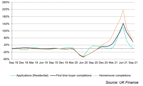 The three-month rolling average of applications and completions collapsed following the end of the Stamp Duty holiday in June. The chances are people brought forward purchases into the first half of 2021 so it’s likely activity will end up being even weaker in 2022, further reducing the upward pressure on house prices.