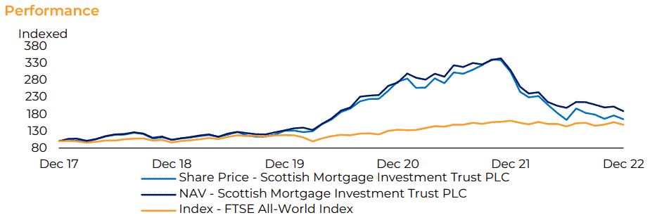 Looking at a longer-term time horizon, the fund’s been successful in delivering strong returns. Over a five-year period, Scottish Mortgage shares outperform the FTSE All-World Index that the company uses as a benchmark.