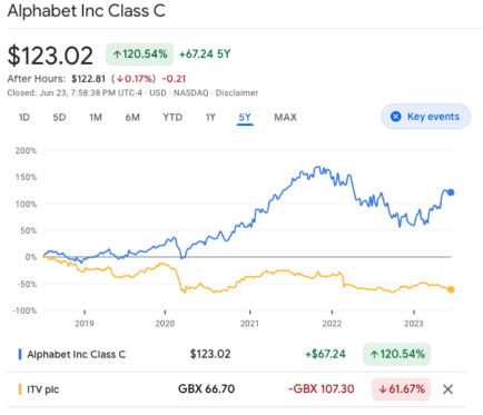 Over the last five years, Alphabet shares have risen about 120% versus a decline of around 60% for ITV.