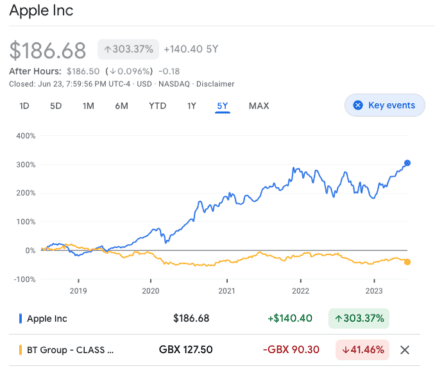 Over the last five years, Apple shares have risen about 300% versus a loss of around 40% for BT.