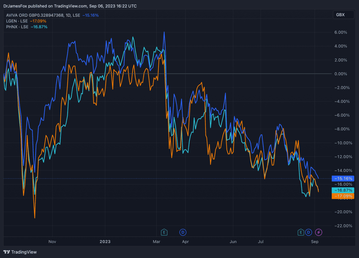 The above chart shows how Aviva has fallen less than Legal & General and Phoenix Group.