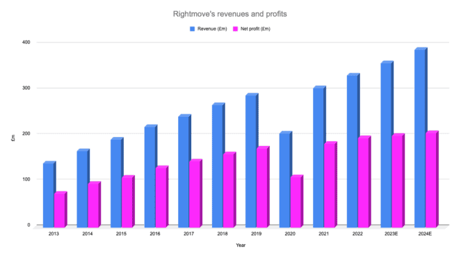 Over the last decade, revenues and profits have increased significantly. It’s worth noting that unlike housebuilders, Rightmove isn’t materially impacted by the property cycle.