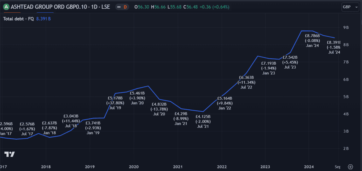 But there’s some concern. With a debt load now exceeding $8bn, Ashtead needs an earnings boost. Although that amount has reduced slightly this year, its debt-to-equity ratio is still above 100%, putting it in a precarious position.