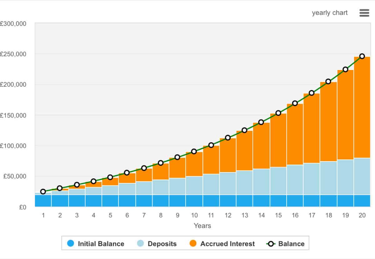 As we can see, over a 20-year period, the portfolio value would potentially push up from £20,000 to almost £250,000. That’s a considerable increase and one that would allow the investor to eventually take a second income worth around £12,500 a year.