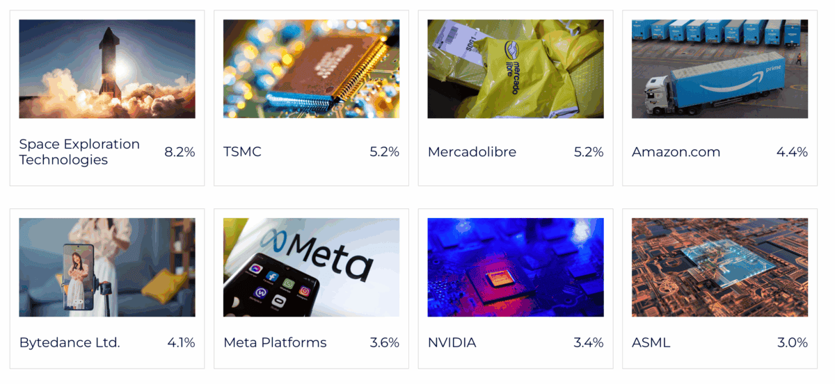 As of 30 November 2025, its largest positions included SpaceX (8.2%), TSMC (5.2%), MercadoLibre (5.2%), Amazon (4.4%), ByteDance (4.1%), Meta (3.6%) and Nvidia (3.4%). Other notable holdings were ASML and Shopify. The top positions carry significant weight, meaning the trust’s performance is highly influenced by its largest bets.
