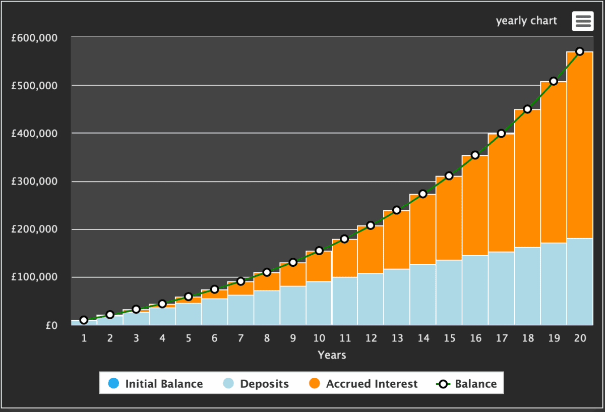 Below, we can see how £750 a month could compound over 20 years, assuming a 10% annualised return. That £500,000 could be reached in 19 years.