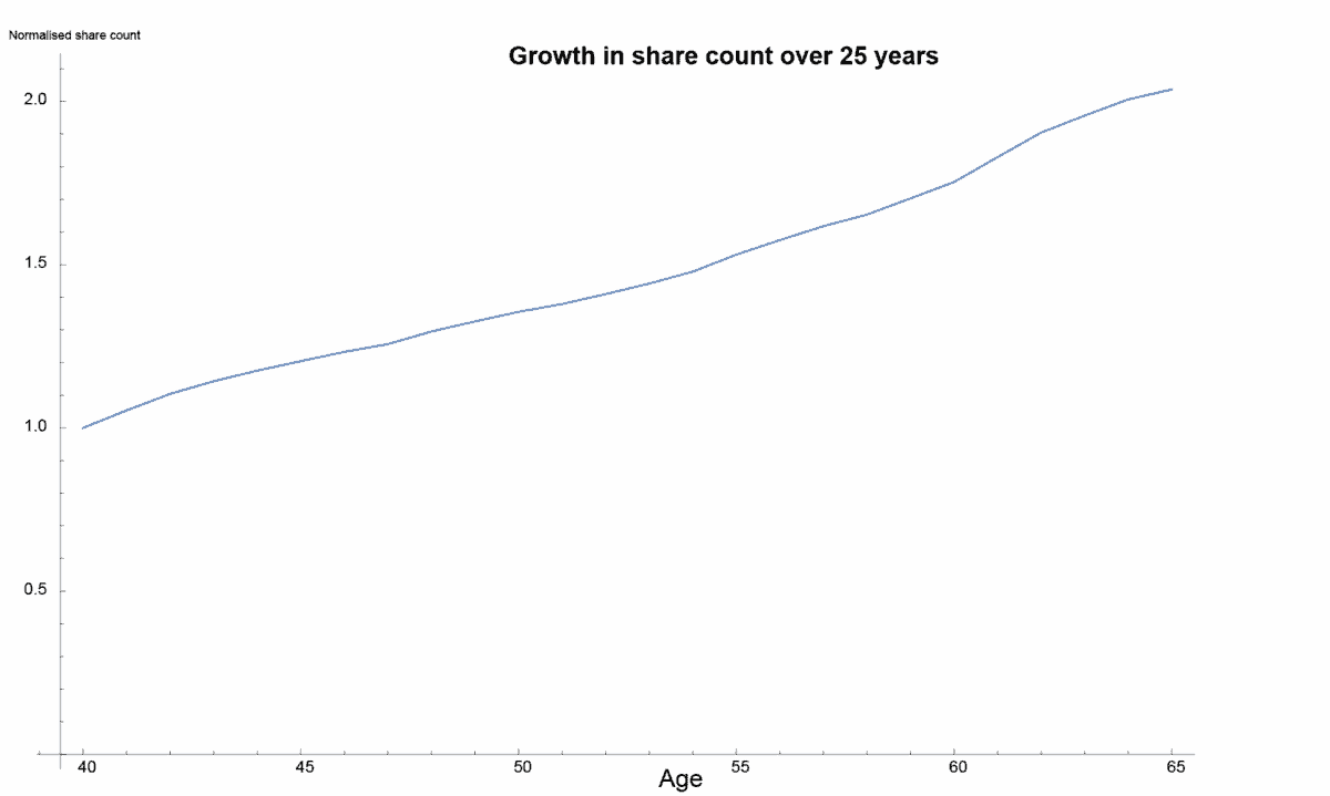 The following chart highlights how that £7,000 gain is created. The vast majority comes from dividends collected and reinvested, with a small amount from modest price growth baked into the model. The chart is normalised to 1, so over 25 years the typical run doubles the number of shares owned – meaning reinvested dividends buy roughly twice as many shares as were started with.
