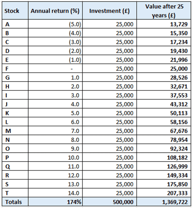 So let’s combine these three ideas and see what might be possible. The table below shows the impact of investing £1,000 a year into 20 stocks for 25 years. I’ve assumed that some of the holdings do better than others with annual returns ranging from -5% to +14%. The idea of having a mixture of winners and losers is a reminder that sometimes not everything goes to plan with the stock market.