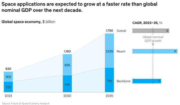 Indeed, McKinsey & Company forecasts that the global space economy will be worth $1.8trn by 2035, with ‘reach’ applications (those helping companies across a wide range of industries to generate more revenue) outperforming ‘backbone’ solutions (for example, satellites, launchers, and GPS).