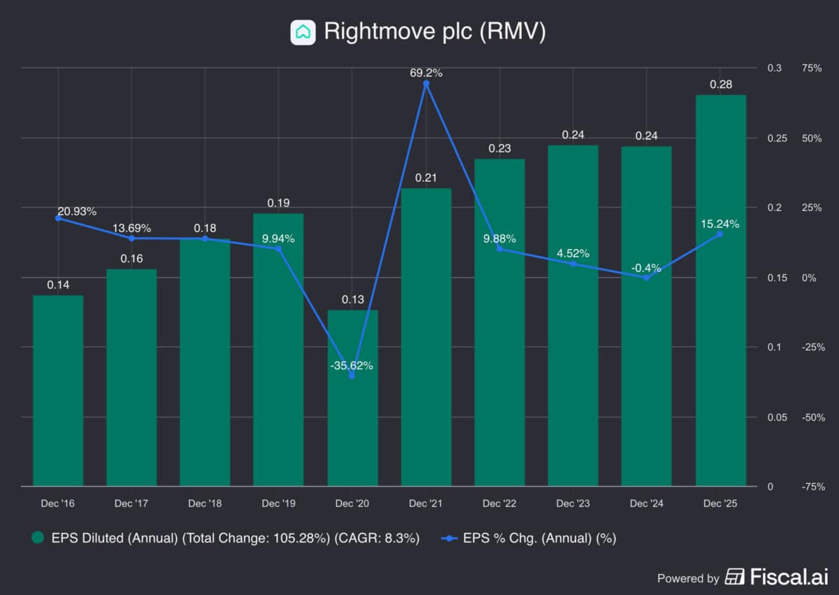 The forecast 15% EPS growth from 2030 looks great. But to get to that point, Rightmove’s planning on spending a lot on artificial intelligence (AI). That means for the next few years, EPS growth’s going to be more like 5%. That’s much lower – and below the firm’s recent average.