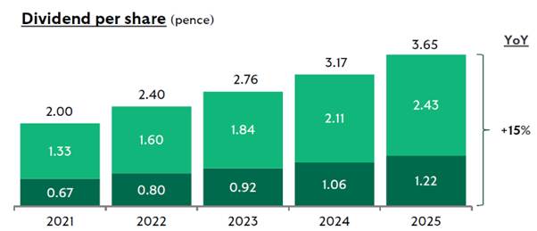 The stock also has an excellent reputation for increasing its dividend. For 2025, its declared payout was 83% higher than in 2021. Analysts are expecting a 58% increase over the next three years to 5.77p. This implies an above-average forward yield of 5.8%.